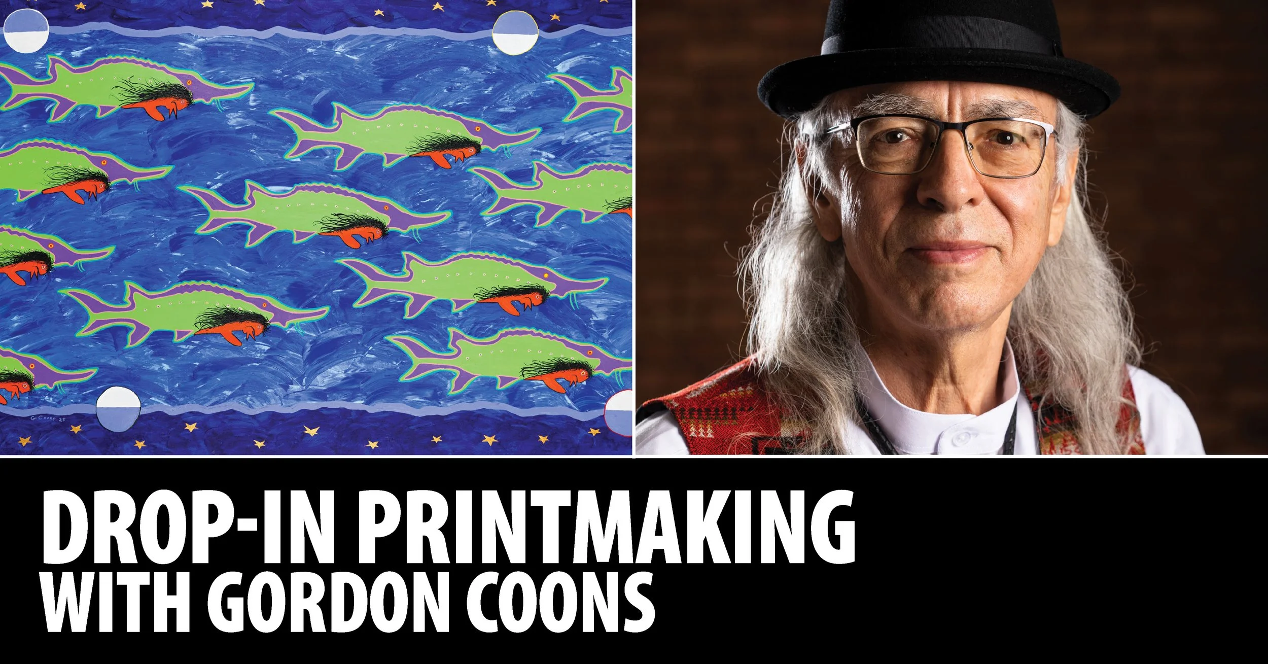 Join Minnesota Marine Art Museum exhibiting artist, Gordon Coons, for drop-in printmaking on Saturday, May 16 from 10:30a - 12p. This lively, all-ages drop-in printmaking experience is inspired by the imagery in his exhibition Gordon Coons: Gidibaajimomin / We Tell Stories, on view at MMAM May 9 - August 30, 2026. This fast-paced, hands-on activity invites participants to experiment with pre-made animal shapes drawn from Coons’ work with no carving required. Simply choose your favorite animal forms, select from a variety of colorful papers, and bring your composition to life through ink and print.