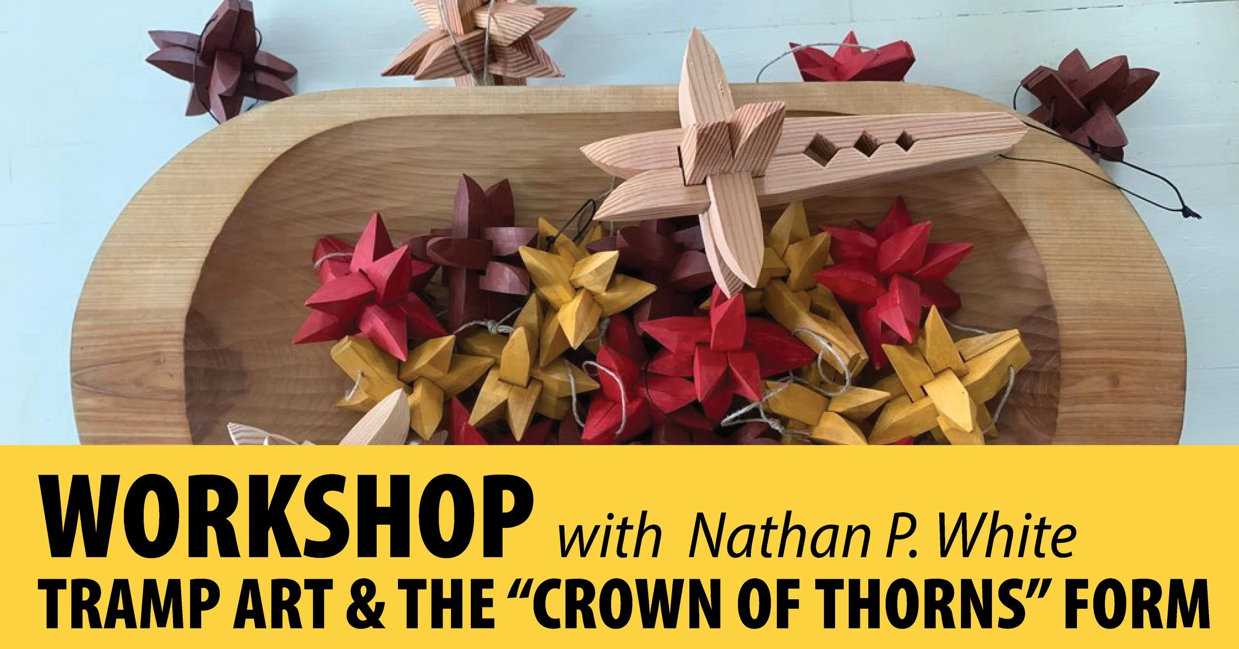 In this hands-on workshop, participants will explore the “Crown of Thorns” construction technique—a hallmark of Tramp Art characterized by carefully notched and interlocking wooden pieces. Guided by woodworker Nathan White, students will learn the fundamentals of knife work, joinery, and hand-carving while crafting a star-shaped ornament or small decorative object. Along the way, Nathan will share insights into the cultural history of the form and its enduring spirit of reuse and creativity.